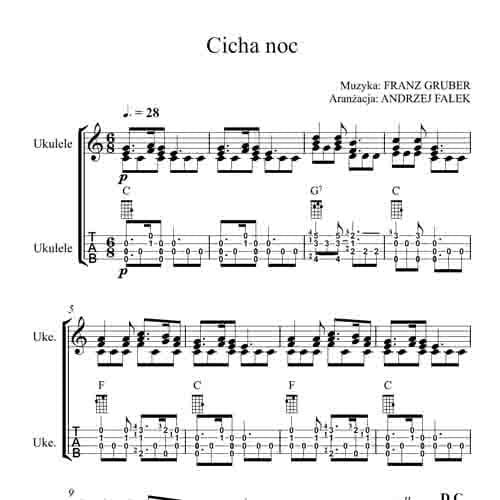 Tradycyjna kolęda „Cicha Noc” / „Silent Night”, w tonacji C-dur opracowana w stylu fingerstyle na ukulele.