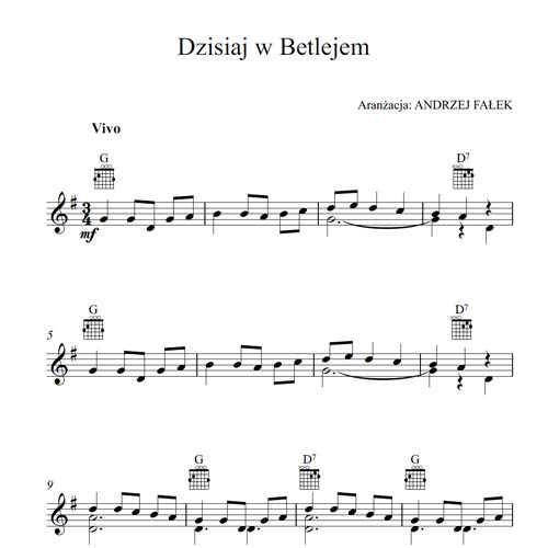 Tradycyjna polska kolęda „Dzisiaj w Betlejem”, w tonacji G-dur opracowana w stylu fingerstyle na gitarę.