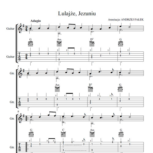 Tradycyjna polska kolęda „Lulajże, Jezuniu”, w tonacji G-dur opracowana w technice fingerstyle na gitarę.